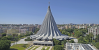 Il progetto con cui i due architetti vincitori, non ancora trentenni, si aggiudicano il concorso internazionale era all’epoca davvero audace. Prevede la realizzazione di una corolla floreale posta sottosopra come metafora dell’elevazione dell’umanità verso Dio. La struttura in calcestruzzo mostra tutta la sua bellezza e complessità nell’interno contribuendo a creare un’atmosfera di raccoglimento nonostante, o grazie, alla grande dimensione.