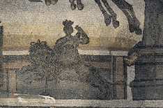 Due personaggi, restituiti dai mosaicisti con vivacità coloristica, accolgono l’auriga trionfatore; il primo è il suonatore di tuba, detto tubicen, che segnala la fine della gara, affiancato da un magistrato vestito con una toga contabulata dorata, che regge i premi costituiti da un sacco con il denaro e un ramo di palma.